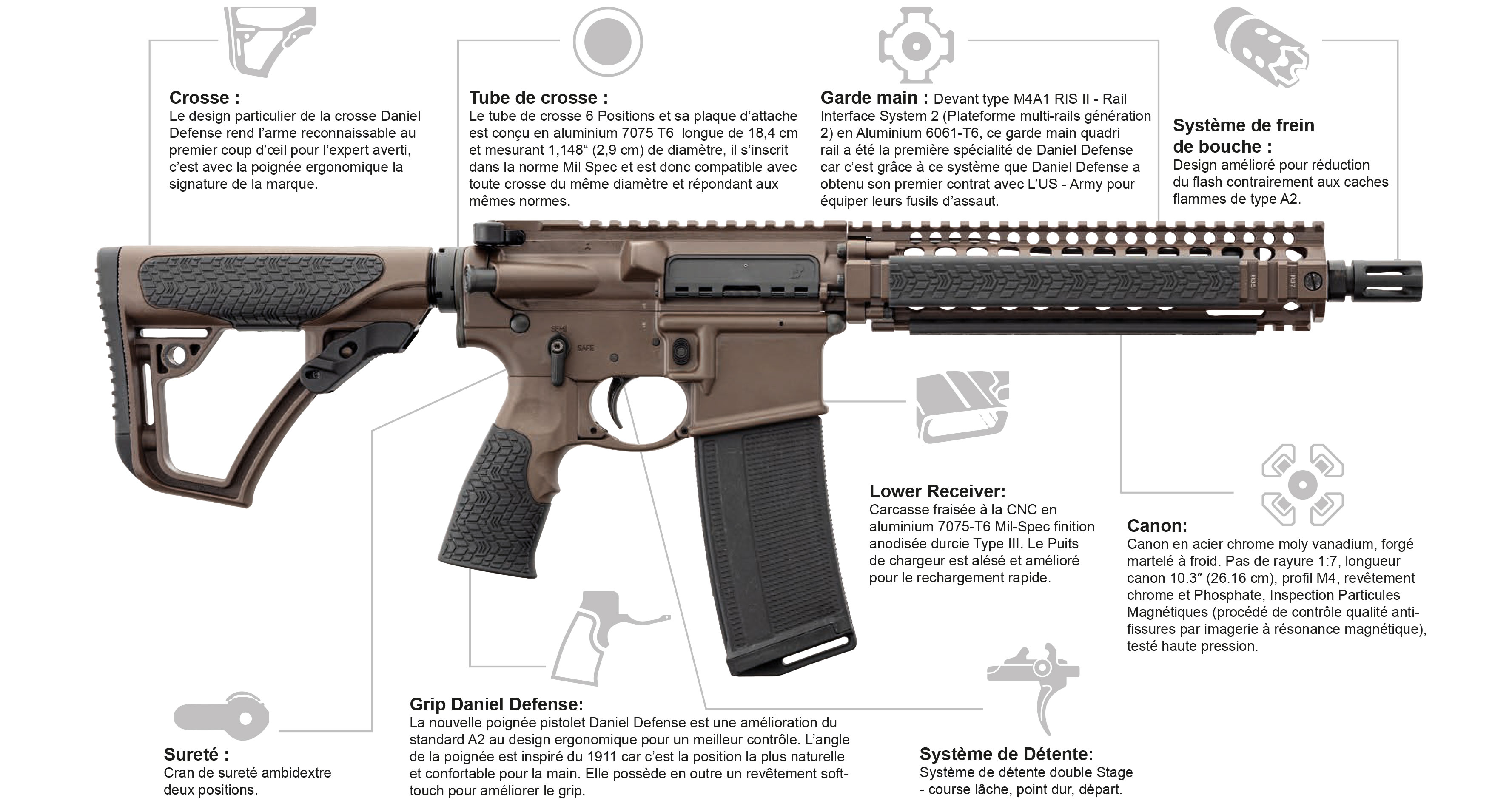 Retrouvez ainsi la gamme DANIEL DEFENSE, offrant une multiplicité de calibres, de tailles de canons et d’équipements.